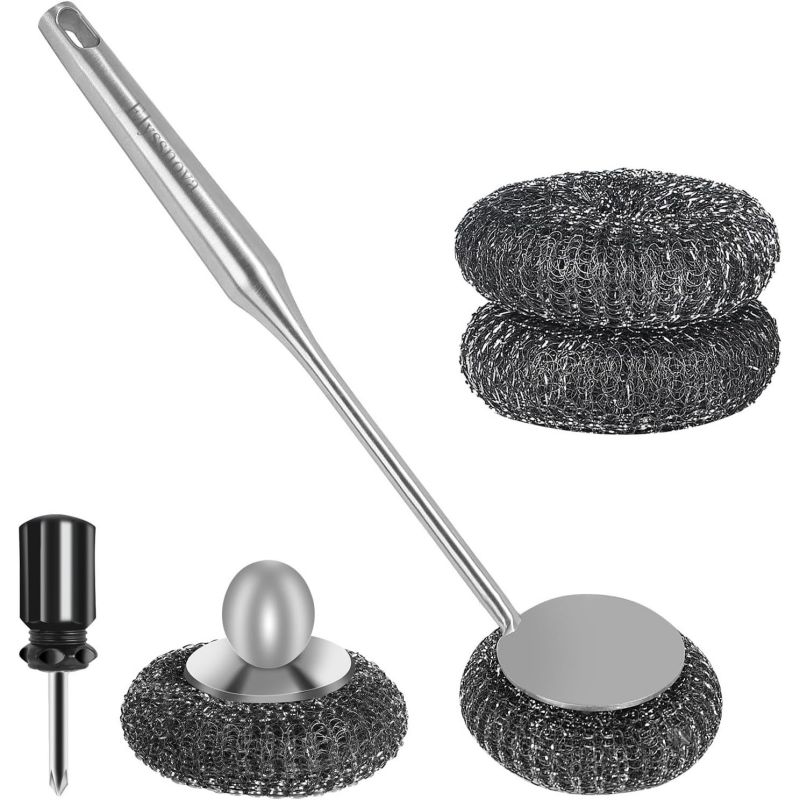 그것은 종종 내구성과 비 슬립 표면을 위해 플라스틱이나 고무와 같은 재료로 만들어집니다. 세척 헤드는 핸들에 부착되며 일반적으로 나일론 강모, 강철 울, 또는 둘 다의 조합과 같은 연마 재료로 만들어집니다.